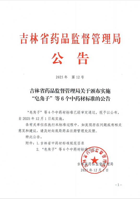 918博天堂关于颁布实施“皂角子”等6个中药材标准的公告 2025年第12号